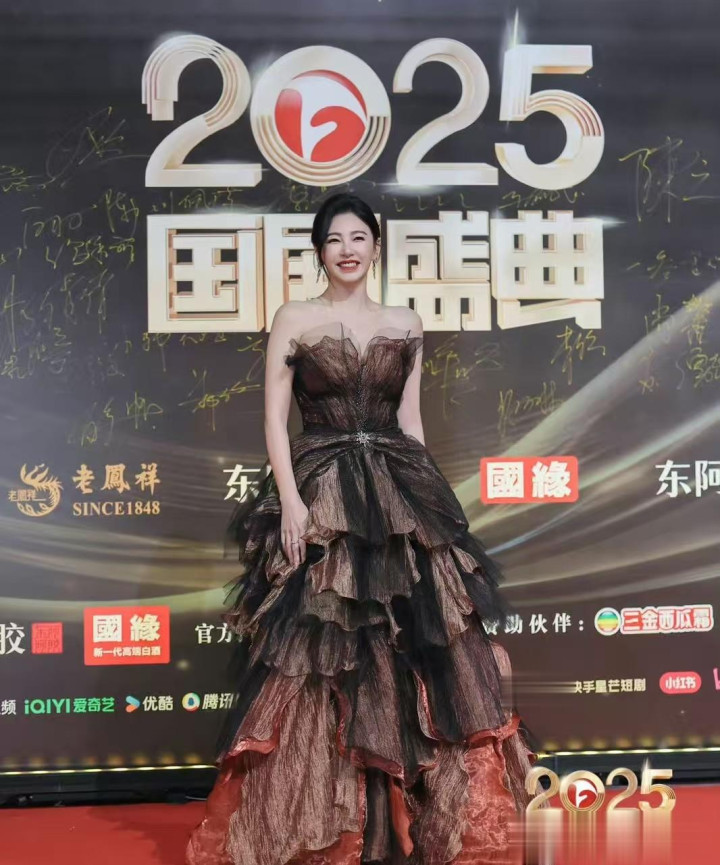 亮片元素的运用恰到好处,没有铺满全身,而是集中在裙摆部分,既增加了造型的吸睛度,又避免了浮夸感。她的“霸气骨相”在这套造型中被发挥到极致,饱满的苹果肌、锋利的眉形、自带气场的眼神,与焦糖色亮片裙的明艳感完美契合,难怪网友直呼“张雨绮就是红毯女王本人”“这气场两米八,无人能及”。