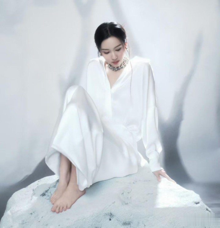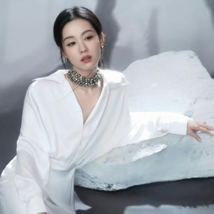 她的窄面鹅蛋脸与清冷气质本就自带“中式仕女”感,白色缎面裙如同水墨画卷中的留白,而珍珠配饰则像是画中的点睛之笔,让整体造型既有古典韵味,又不失现代简约。