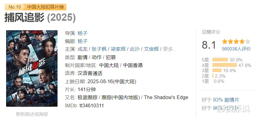不过,虽说《捕风追影》实现了口碑和票房的双赢,可此片并没有真正走出国门在海外大火。就算是有成龙这样的国际一线巨星支撑,它也未能做到这一点。